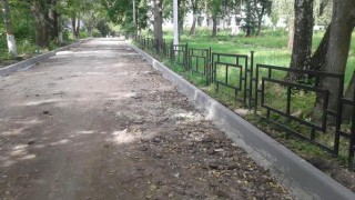 В настоящее время там заканчивают укладку бордюров. Кропотливая и тяжелая работа выполняется вручную. Одновременно спиливают деревья, подготавливая таким образом место для установки детской площадки. Уже завезены песок и щебень – основание под укладку асфальта. После окончания этих работ в планах – обустройство газона.
