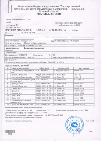 К "тульским пряникам" поступили результаты анализа водопроводной воды города Алексина, проведенного специалистами Государственного центра стандартизации метрологии и испытаний.