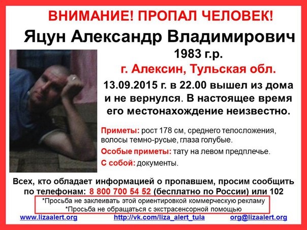 29 сентября в соцсетях появилась информация о поисках Яцуна Александра Владимировича 1983 года рождения. Мужчина вышел из дома в Алексине 13 сентября в 22.00 и не вернулся.