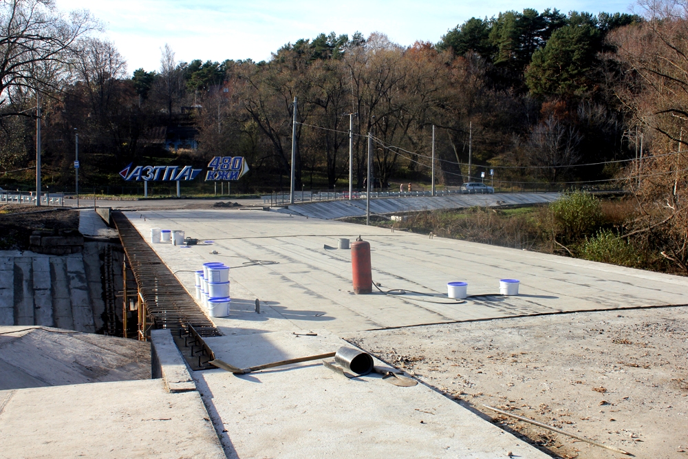 На сегодняшний день на 98% завершена работа на подходах к мосту, балки полностью заменены, установлена накладная плита, выполнена гидроизоляция. Ремонт конструкций под мостом завершен на 90%.