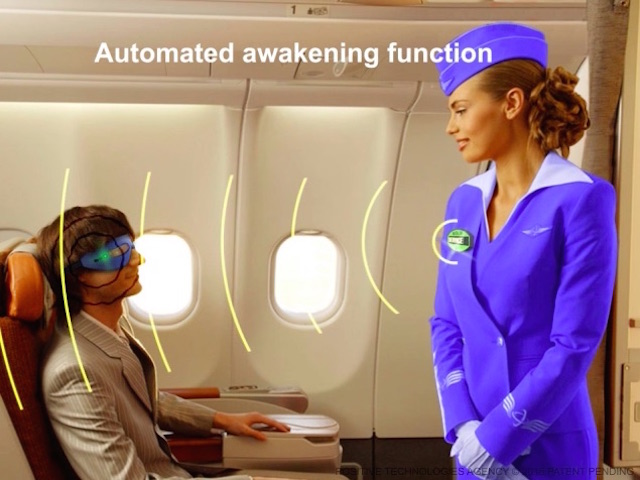 Кроме этого, в маску встроен миниатюрный вибрирующий модуль и светодиодный источник прерывистого светового сигнала, которые в нужное время будят пассажира. Для этого предусмотрен небольшой прибор у бортпроводников, который посылает сигнал на блок управления маски. Если пассажир планирует, чтобы его разбудили для завтрака, он может включить режим пробуждения. Если же он хочет поспать вволю, то прибор просто отключает.