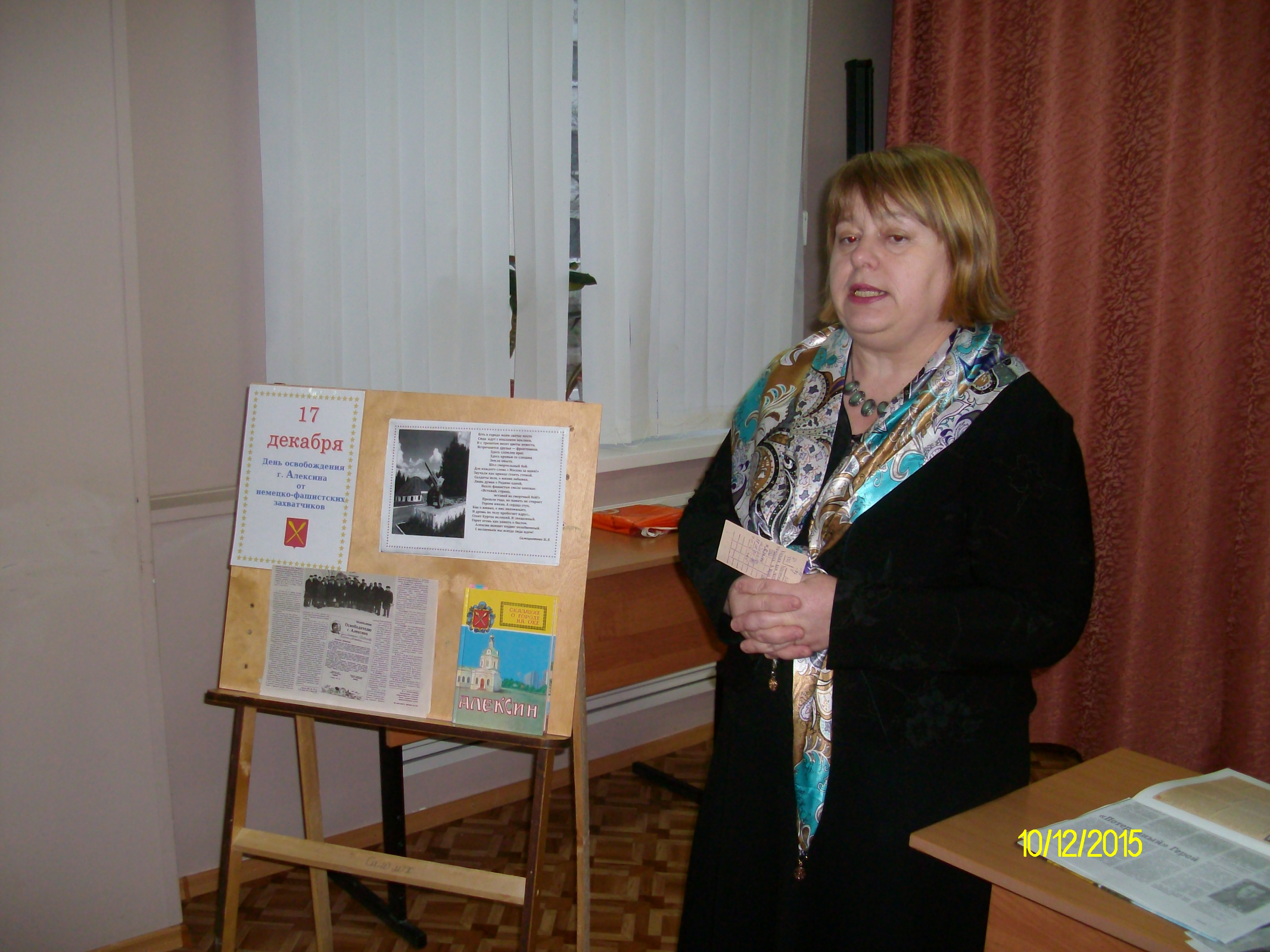 Ребятам был представлен большой книжно-иллюстративный материал. Школьники с интересом слушали рассказ о десятикласснике Володе Федоровском, погибшем накануне освобождения Алексина; о «потерянном» Герое Советского Союза, нашем земляке - Николае Гавриловиче Серебрякове; о жизни и подвиге девушек-снайперов Наталье Ковшовой и Марии Поливановой; о 238-й дивизии, солдаты которой стояли насмерть за наш город; о генерале Геннадии Петровиче Короткове, который завещал похоронить его у братских могил своих солдат, погибших за освобождение Алексина, что и было исполнено.