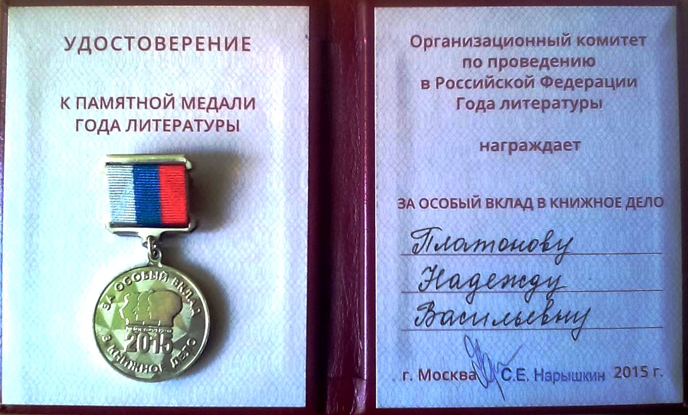 Эта памятная медаль учреждена Федеральным агентством по печати и массовым коммуникациям и посвящена прошедшему в 2015 году в России Году литературы. Медаль вручается наиболее активным участникам и организаторам мероприятий, проводимых в рамках Года литературы. И наша Надежда Васильевна вошла в число девяти «счастливчиков» из Тульской области.