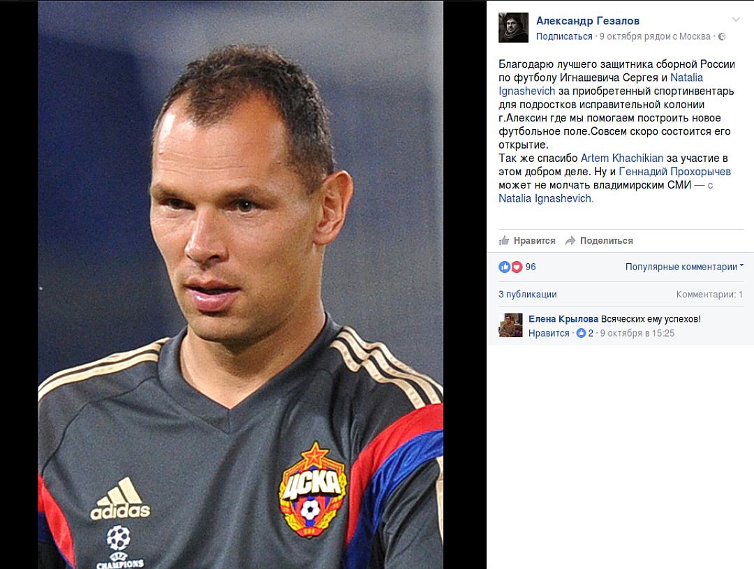 - Благодарю лучшего защитника сборной России по футболу Сергея Игнашевича и Наталью Игнашевич за приобретенный спортинвентарь для подростков исправительной колонии г. Алексин, где мы помогаем строить новое футбольное поле, - написал Гезалов. - Совсем скоро состоится его открытие.