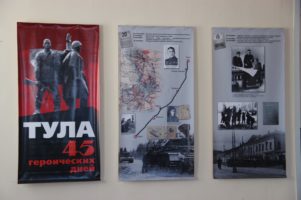 Тула - один из немногих городов-героев Великой Отечественной войны, который отбил все атаки противника и остался непокорённым. Тульская операция продолжалась 45 дней, длилась с октября по декабрь 1941 года. Тула должна была стать плацдармом для нападения на Москву. Так хотел Гитлер. Он в очередной раз не учел несгибаемого духа советского народа. Оборона Тулы имела большое значение в стабилизации линии фронта на южных подступах к Москве. Она выдержала удары противника, находясь в полном окружении, и сковала его крупные силы. 12 баннеров с фотографическим и информативным материалом красноречиво знакомят посетителей с одним из периодов нашей истории.
