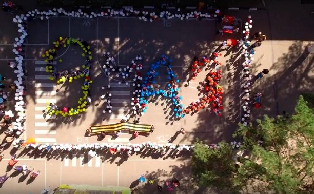 Они сделали в настоящую «живую» открытку – выстроились на школьном дворе в виде надписи «9 мая» и растянули вдоль букв георгиевскую ленту. Всё это ребята сняли на видео. В необычном праздничном флэшмобе приняли участие более 200 человек. Автор видео: Сергей Дубинин.