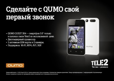 Tele2, альтернативный оператор мобильной связи, объявляет о старте эксклюзивных продаж современного функционального смартфона QUMO Quest 354 по самым низким ценам. Акция будет проходить в период с 15 августа по 15 сентября в салонах связи Tele2 Тульской области. Гаджеты популярного южнокорейского бренда QUMO обладают внушительным функционалом и позволяют пользователю решать широкий диапазон задач. Смартфон Quest 354 выполнен в стильном эргономичном корпусе и оснащен емкостным сенсорным 3,5-дюймовым экраном. Он работает на основе операционной системы Android 4.2, которая позволяет решать любые коммуникационные задачи, скачивать игры, приложения, книги и фильмы в магазине Google Play. Устройство обеспечивает работу с двумя SIM-картами, поддерживает карты памяти стандарта MicroSD, а также позволяет передавать файлы по Bluetooth. Специальная акционная цена смартфона QUMO Quest 354 только в салонах связи Tele2 составит 1790 рублей. Пользователи смартфонов могут снизить затраты на связь, подключив услугу «Интернет с телефона», которая позволит общаться в социальных сетях, проверять почту и пользоваться мессенджерами на выгодных условиях. Абоненты Tele2 за символическую плату (5 рублей/сутки) могут использовать до 75 мегабайт интернет-трафика ежедневно. Анатолий Струков, коммерческий директор макрорегиона «Центр» Tele2: «Качество по разумной цене – важнейший принцип компании Tele2. Наше новое предложение полностью соответствует данной философии и дает возможность стать обладателем современного и функционального смартфона за небольшие деньги. Несмотря на скромную стоимость, устройство обладает внушительным функционалом и позволяет решать широкий диапазон задач, среди которых передача данных, выход в интернет, расширение возможностей за счет установки мобильных приложений. Безусловно, смартфон с таким соотношением «цена/качество» станет отличным подарком к началу учебного года и окажется верным помощником школьнику или студенту». Акция будет проходить в период с 15 августа по 15 сентября в салонах связи Tele2 в Тульской области, расположенных по адресам: • г. Тула, ул. Октябрьская, 95; • г. Тула, ул. Октябрьская, 9; • г. Тула, ул. Демонстрации, 1Г; • г. Тула, ул. Ленина, 65; • г. Новомосковск, ул. Садовского, 18; • г. Щекино, ул. Советская, 12; • г. Киреевск, ул. Мира 14.
