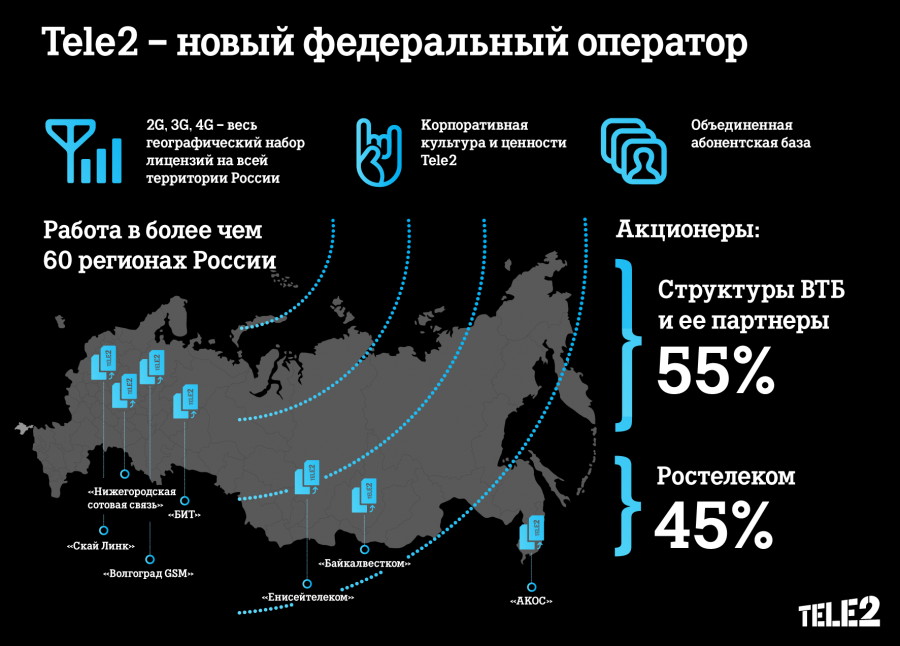 Москва – Tele2, альтернативный оператор мобильной связи, и «Ростелеком», национальный оператор связи, объявляют о закрытии второго этапа сделки по интеграции мобильных активов и юридическом завершении создания нового федерального сотового оператора. В рамках закрытия второго этапа сделки «Ростелеком» внес в капитал создаваемого на базе Tele2 нового федерального сотового оператора 100% акций ЗАО «РТ-Мобайл», который включает широкий набор сотовых лицензий 2G/3G и федеральную 4G-лицензию. В ходе первого этапа сделки 28 марта 2014 года Tele2 были переданы семь дочерних сотовых компаний «Ростелекома»: «СкайЛинк», «Нижегородская сотовая связь», «Байкалвестком», «БИТ», «Волгоград GSM», «Енисейтелеком» и «АКОС». Акционерами нового федерального сотового оператора являются группа ВТБ, группа банка «РОССИЯ», страховая группа «СОГАЗ» и структуры Алексея Мордашова, которым принадлежит 55%, и «Ростелеком», владеющий 45%. После закрытия второго этапа сделки новый федеральный сотовый оператор Tele2 стал оказывать услуги связи в более чем 60 регионах России, получил лицензии 2G/3G во всех федеральных округах и 4G-лицензию на всю территорию России. В данный момент Tele2 продолжает переводить активы «Ростелекома» на единые бизнес-процессы и приводить их в соответствие с общей организационной структурой. В рамках интеграции запланирован ребрендинг сотовых компаний. Широкий набор сотовых лицензий сотовый оператор будет использовать для выхода в новые регионы, повышения качества работы сети в действующих регионах, расширения ассортимента услуг, в том числе запуска услуги скоростного мобильного интернета. Михаил Носков, генеральный директор Tele2: «Мы стали участниками очень важного события в телекоммуникационной отрасли России – создания нового федерального сотового оператора на базе Tele2. Появление еще одного крупного игрока, действующего в масштабах всей России, серьезно изменит картину рынка: приведет к развитию конкуренции, повышению доступности услуг связи для населения. Tele2 продолжит работать по уникальной бизнес-модели дискаунтера, доказавшей свою эффективность за десять лет. Стратегия оператора на ближайшие годы предполагает быстрое развитие − строительство новых сетей и модернизацию существующих для формирования полноценного федерального покрытия с полным спектром современных мобильных услуг».