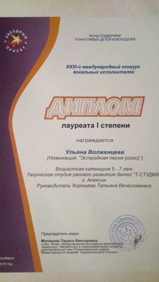 Воспитанница "Т-студии" Ульяна Волженцева (5,5 лет), отстояла честь своего города на XXXI МЕЖДУНАРОДНОМ КОНКУРСЕ вокальных исполнителей - получив звание "ПОБЕДИТЕЛЯ конкурса, ЛАУРЕАТА I степени". Номинация "сольное исполнение, эстрадная песня. Младшая группа 5-7 лет. ))) МЫ ПОБЕДИТЕЛИ!!!! Теперь у нас в городе есть настоящий 5-тилетний ЛАУРЕАТ!!!