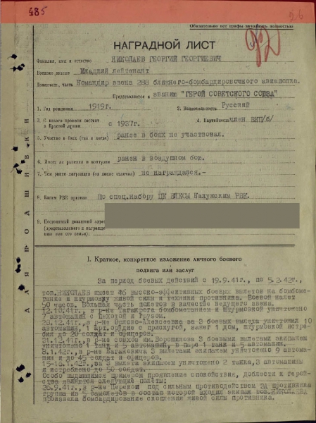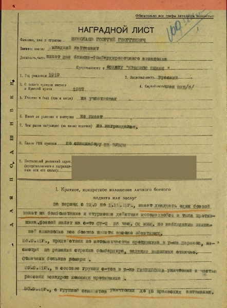 Николаев Георгий Георгиевич - командир звена 288-го ближнебомбардировочного авиационного полка 21-й смешанной авиационной дивизии Южного фронта, младший лейтенант.