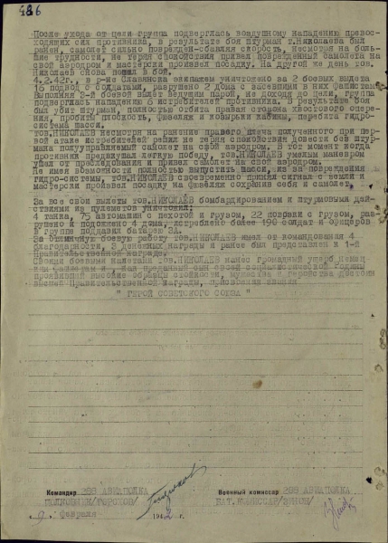 Командир звена 288-го ближнебомбардировочного авиационного полка (21-я смешанная авиационная дивизия, Южный фронт) младший лейтенант Георгий Николаев к февралю 1942 года совершил сорок шесть успешных боевых вылетов, уничтожил четыре танка, семьдесят пять автомашин с пехотой и грузами, подавил зенитную батарею противника.